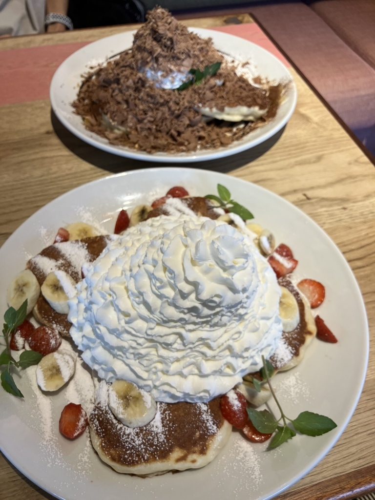 If you prefer fruit-topped decadence, the ストロベリー&バナナホイップパンケーキ is renowned as the café's most popular dish. This delightful creation is generously layered with sweet strawberries and ripe bananas, adorned with a mountain of whipped cream that’s impossible to resist. Every bite bursts with flavors that take you on a nostalgic journey of comfort and happiness for only JP¥1,749.